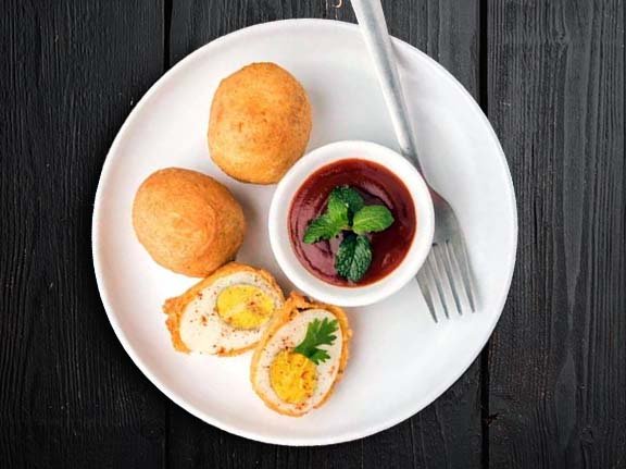 Boiled eggs coated with besan (legume flour) batter, deep fried & served with onions.