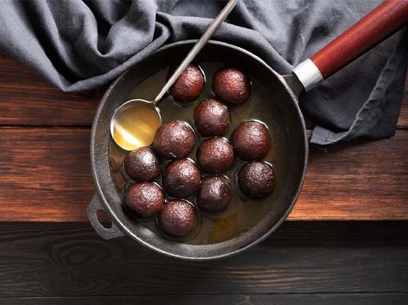 Golden-fried dumplings of milk pastry are soaked in a sweet, saffronenriched syrup and served hot.