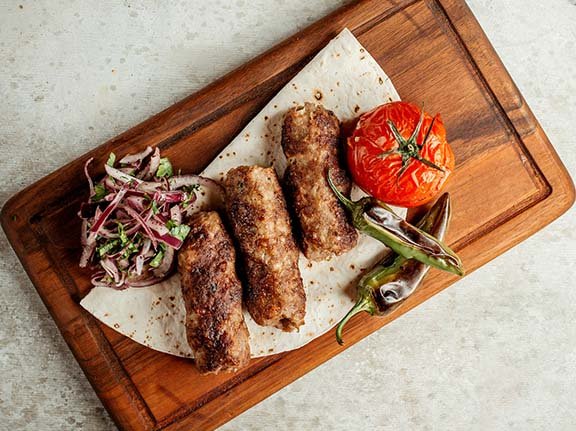 Minced lamb meat mixed with onions, ginger, garlic and spices & skewered.