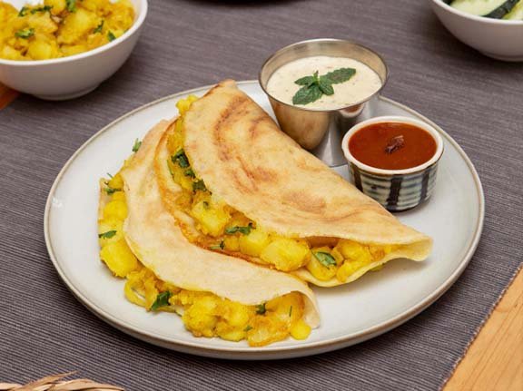 The classic Crepe is stuffed with Potato and Masala. Enjoy this tasty, wholesome treat.served with coconut chutney and lentil dal.