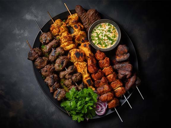 Platter of Mixed kabobs ( Chicken Tikka, Murg Malia Kabob, Tandoori Chicken, Seekh Kabob).