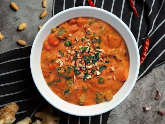 Mixed fresh vegetables with nuts simmered in a creamy sauce laced with spices.