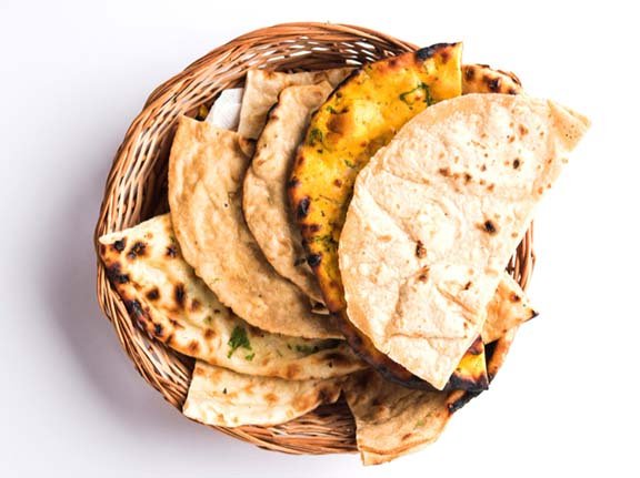 Assorted bread – naan, butter naan, onion kulcha, roti.