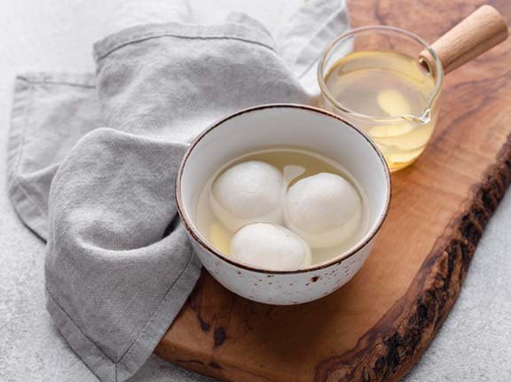 Sweet dumplings of cottage cheese served in chefs special sweetened flavored milk, garnished with pistachio and almonds.